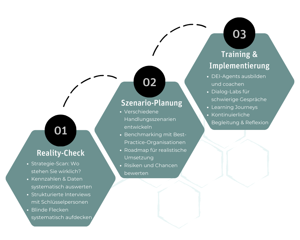 Unser Ansatz: Business first - Diversity als Erfolgsfaktor, nicht als Selbstzweck. Dabei setzen wir auf erlebnisorientierte statt belehrende Methoden. Unsere 25+ Jahre Erfahrung zeigen: Echte Transformation entsteht durch systematisches Aufdecken blinder Flecken und nachhaltiges Verändern von Strukturen.